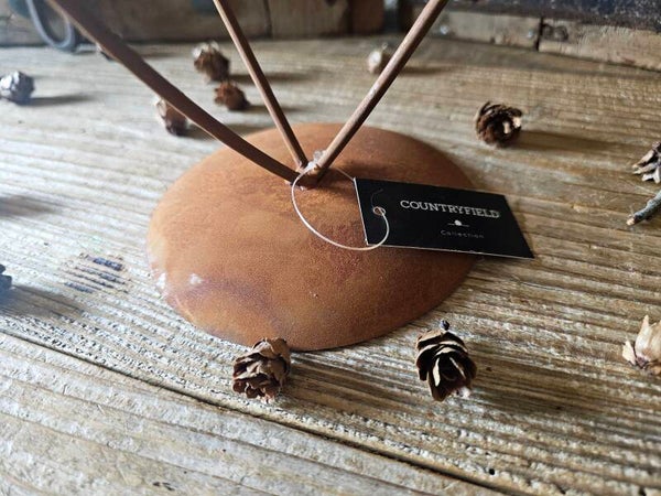 Metalen ornament van drie paddenstoelen in roestige bewerking van het merk Countryfield. Afmeting: 41x36cm