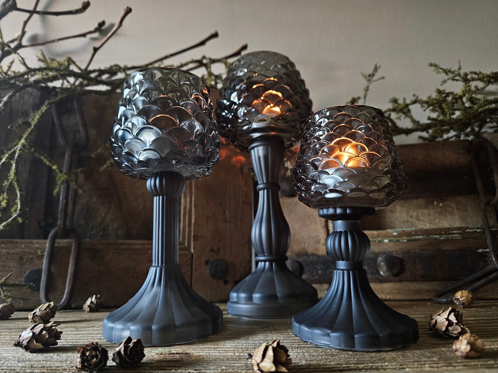 Wauw! Wat een mooie kandelaren/ waxinelichten op voet in de vorm van een dennenappel. Helemaal perfect voor het najaar!Afmeting klein: 15x8cm (HxB)Afmeting middel: 19x9cm (HxB)Afmeting groot: 26x11cm (HxB)